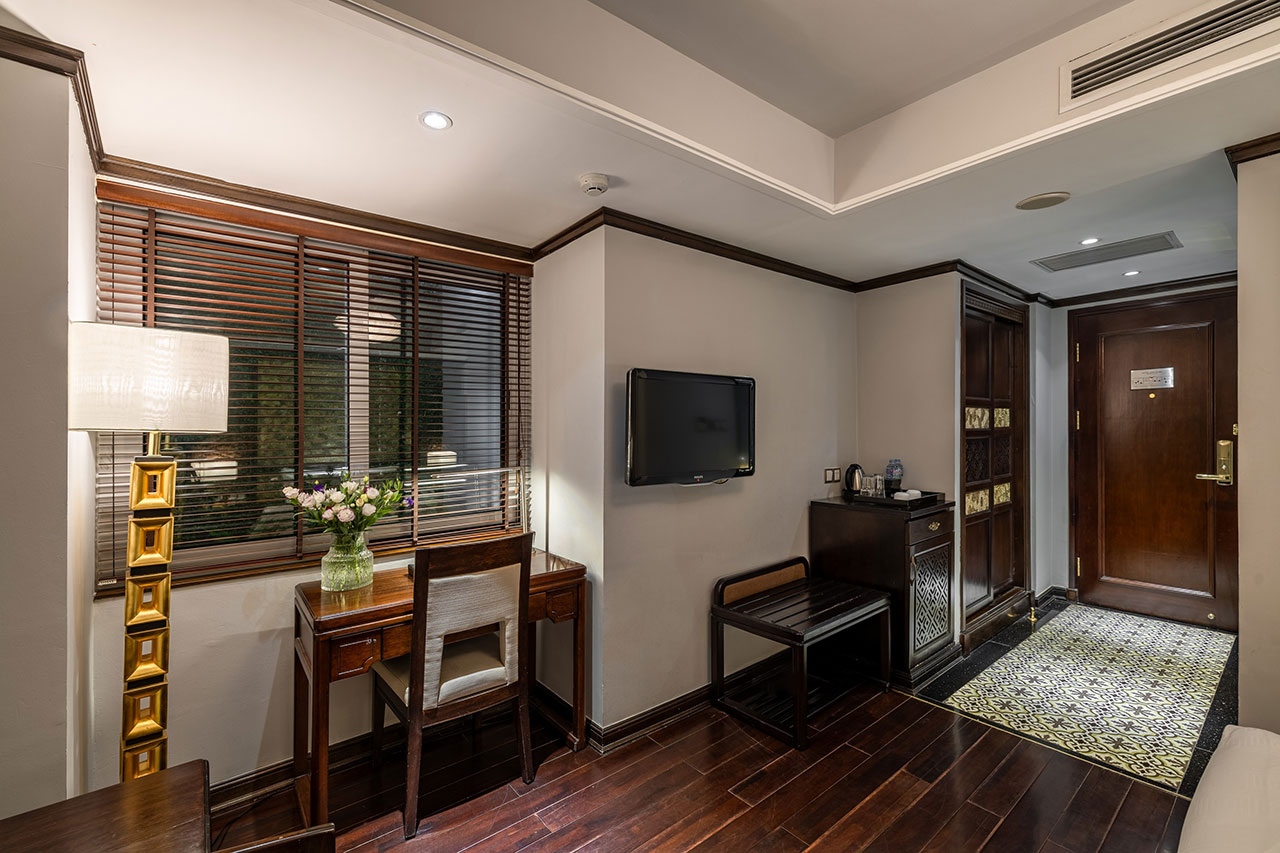 Start your stay in style with our Deluxe Internal Window room – an intimate, thoughtfully curated space offering the choice of 1 plush double bed or 2 luxuriously appointed single beds. Bathed in soft natural light from the skylight, this room exudes a serene and airy ambiance, perfect for unwinding after a day immersed in the rich cultural tapestry of Hanoi.